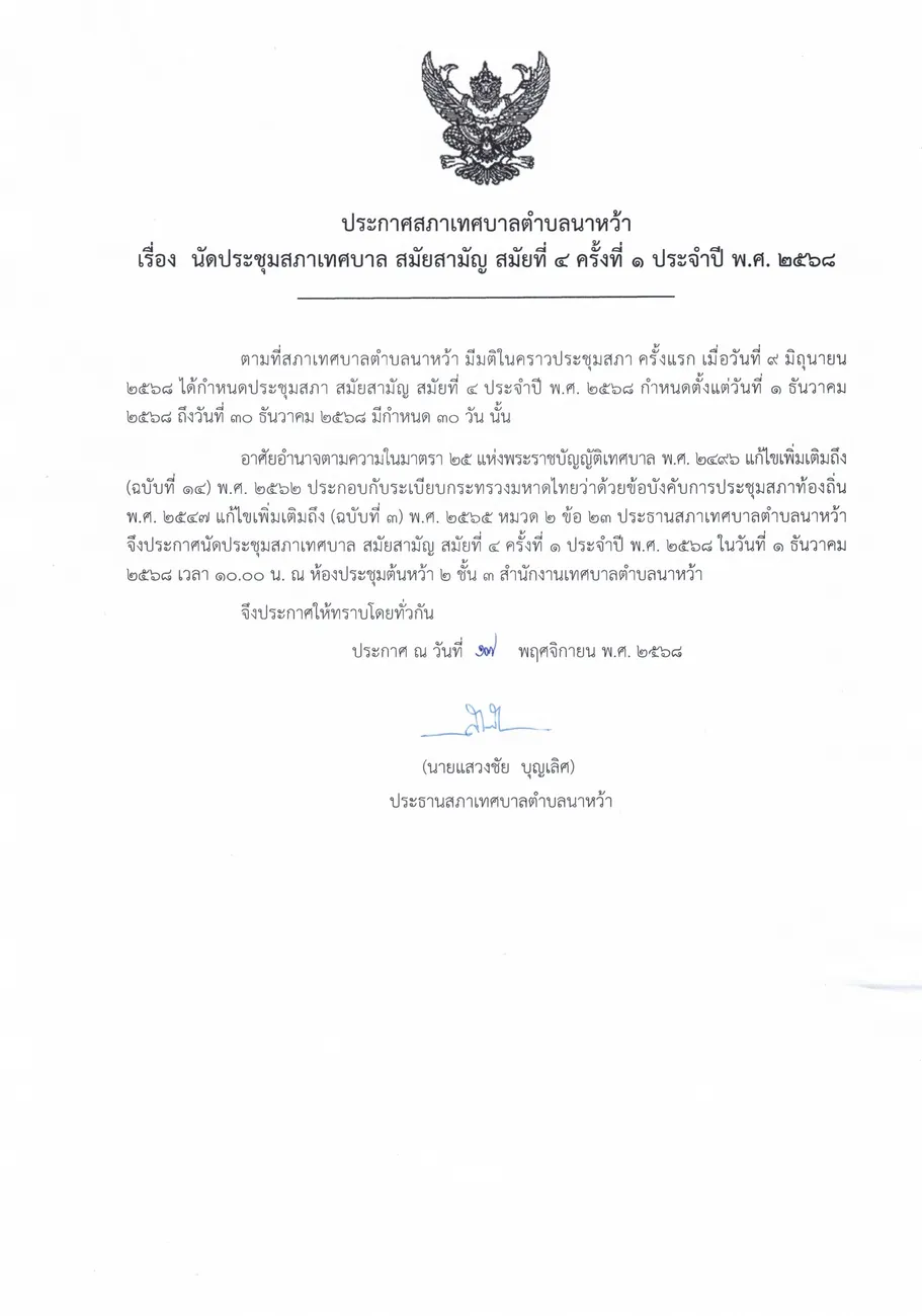 ประกาศสภาเทศบาลตำบลนาหว้า เรื่อง เรียกประชุมสภาเทศบาล สมัยสามัญ สมัยที่ 4 ประจำปี พ.ศ. 2568