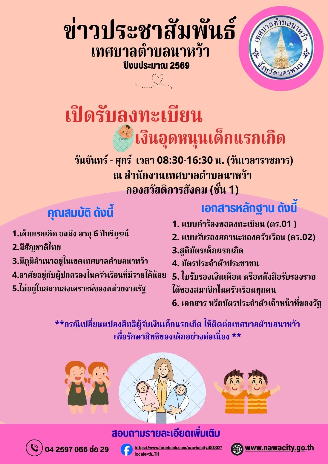ประชาสัมพันธ์เทศบาลตำบลนาหว้า เปิดรับลงทะเบียนโครงการเงินอุดหนุนเพื่อการเลี้ยงดูเด็กแรกเกิด ตั้งแต่ 1 ตุลาคม 2568 ถึง 30 กันยายน 2569วันจันทร์ - ศุกร์ 08.30 - 16.30 น. (วันเวลาราชการ)ณ สำนักงานเทศบาลตำบลนาหว้า กองสวัสดิการสังคม (ชั้น 1)